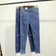 清仓春夏新款高腰修身膝盖锯齿破洞裤脚剪边牛仔小脚裤女