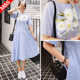 17夏韩版小清新学生宽松高腰显瘦花朵刺绣短袖蓝色条纹连衣裙中长