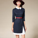 Riwins2016秋装新品女装优雅气质条纹小翻领修身七分袖收腰连衣裙