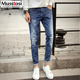 2016秋季新款男士牛仔裤蓝色修身款漂白水洗韩版小脚裤潮男长裤子