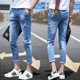 夏季簿款破洞九分牛仔裤男修身小脚裤哈伦青少年裤子男韩版9分裤