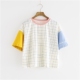 文艺小清新 格子拼接宽松短款圆领半袖纯棉学生短袖T恤夏装上衣女