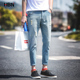 春季破洞牛仔裤男 修身型小脚裤青少年九分裤男 韩版潮流百搭裤子