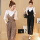夏季新款长袖蕾丝打底衫+无袖V领背带连体裤时尚气质七分阔腿裤女