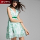 WVFV欧美夏季女装小清新V领绿色碎花印花修身大摆无袖连衣裙