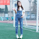 2017春新款可拆卸破洞牛仔背带裤女夏九分裤宽松学生束脚裤牛仔裤