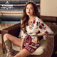 2017春装新款气质优雅复古风衣裙重工印花镶钻系带大摆连衣裙女春