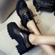夏季粗跟厚底镂空女鞋圆头网纱透气真皮休闲学生系带高跟单鞋黑色