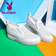 花花公子女鞋夏季镂空内增高小白鞋女真皮透气白色系带休闲鞋单鞋