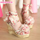 包邮2017夏季新款女鞋 时尚蕾丝休闲镂空鱼嘴高跟坡跟防水台凉鞋