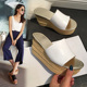 萌她2016夏季新款欧美一字型松糕厚底坡跟真皮凉拖女鞋沙滩女拖鞋