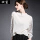 狄黛2016秋季新款螺纹针织衫拼接蕾丝灯笼袖前短后长套头宽松毛衣