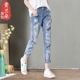 2017夏季新款学生系带浅色哈伦裤牛仔七分裤女中腰破洞宽松乞丐裤
