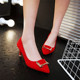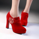 春秋季深口单鞋粗跟高跟鞋防水台水钻女鞋红色结婚鞋蝴蝶结新娘鞋