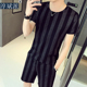 夏季条纹套装男士短袖T恤两件套潮流夏天短裤男五分裤套装男韩版