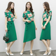 名媛2017新款女装夏装修身中长款连衣裙女雪纺印花绿色短袖裙套装