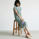 寺山文也 绿色条纹肌理丝麻连衣裙中长款短袖亚麻长裙女夏 翠潋