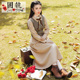 固执闭月羞花2017春季新款复古文艺气质立领枣红九分袖连衣裙