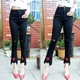 2017春夏季新款不规则毛边刺绣破洞牛仔裤女九分裤弹力紧身小脚裤