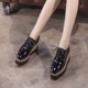 黑色松糕鞋女春秋2017厚底新款漆皮内增高女鞋布洛克系带坡跟单鞋