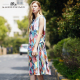 europrimo派茉欧美高端连衣裙中长款长袖V领端庄大气印花雪纺长裙