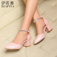 伊莲雅春夏新款粗跟尖头高跟鞋包头中空水钻女凉鞋子白色上班鞋