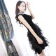 2017春夏新款轻奢重工钉珠真丝绒鸵鸟毛显瘦日常连衣裙年会礼服裙