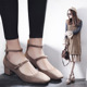 小红人2017春季复古绒面方头中跟女鞋浅口粗跟单鞋扣带时尚温州鞋