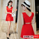 红色连衣裙夏2017新款修身显瘦高腰v领红色礼服中长款韩版蓬蓬女