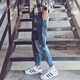 韩国东大门新品个性破洞修身小脚牛仔裤毛边裤脚显瘦黑色潮牛仔裤