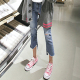 现货TT韩国代购2017春季新款涳磨破洞九分微喇叭牛仔裤女pt63097