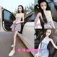 2017夏装新款夜店女装性感低胸交叉吊带上衣时尚修身条纹短裙套装