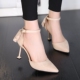 春夏新漆皮尖头细跟浅口绑带铆钉一字扣高跟鞋单鞋裸色女鞋时装鞋