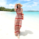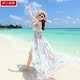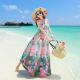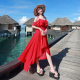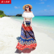 新款夏女印花露肩海边度假修身显瘦沙滩裙波西米亚中长裙连衣裙仙