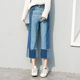 2017春新款个性不规则韩版学生翻卷毛边高腰牛仔阔腿裤女宽松直筒