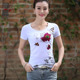 柳晶2017夏装纯棉短袖t恤女 V领修身民族风印花蕾丝袖大码体恤女