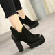 韩版新款绒面圆头防水台粗跟高跟鞋女兔毛侧拉链加绒短靴及踝靴子