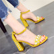 2017夏季新款韩版珍珠黄色粗跟高跟鞋淑女一字扣绒面包根凉鞋女潮