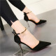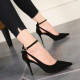 春季新款性感尖头中空细跟高跟鞋女夏性感绒面水钻浅口一字扣单鞋