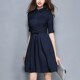 2017春秋新款女装七分袖气质收腰v领打底a字裙绣花优雅淑女连衣裙