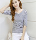 大码一字领上衣七分袖黑白条纹中袖t恤女长袖修身打底衫百搭春装