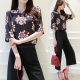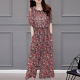 2017新款女装春夏两件套裤韩版印花中袖雪纺衫高腰阔腿裤时尚套装