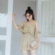 连衣裙女夏2017新款小清新黄色雪纺露肩吊带裙一字肩a字连衣裙子