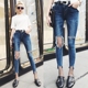 韩国冬新做旧烟灰色破洞牛仔裤女九分裤脚毛边紧身显瘦小脚铅笔裤