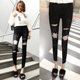 韩国新款黑灰破洞斜脚边乞丐牛仔裤女九分高腰紧身显瘦小脚铅笔裤