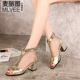 麦丽图夏季新款真皮网纱凉鞋女 中跟鱼嘴凉靴粗跟水钻性感女凉鞋