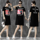 连衣裙女夏2017新款韩版中长款开叉印花修身显瘦黑色短袖T恤裙子