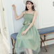 希思瑶2017学院风绿色网纱吊带裙两件套韩版中长款露肩连衣裙女夏