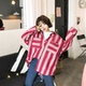 2017春装韩版慵懒风简约粗条纹宽松长袖格子衬衫女韩范中长款衬衣
