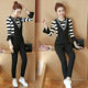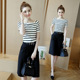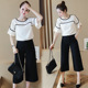 阔腿裤套装夏女2017春装新款夏装条纹拼接高腰韩版气质长裤两件套